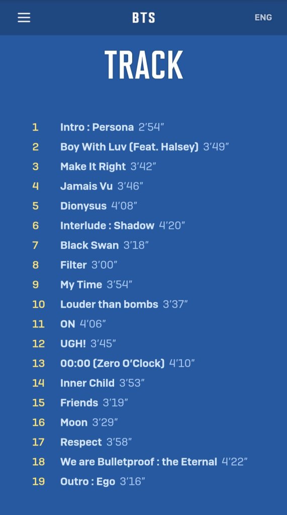 Finally BigHit announced the tracklist of BTS’s new album ‘Map Of The Soul 7’. On the official BigHit site there were 19 songs in which few of them such as ‘Boy With Luv (Feat. Halseyl)’ ‘Jamais Vu’, etc. are released again, while there are several new ones.